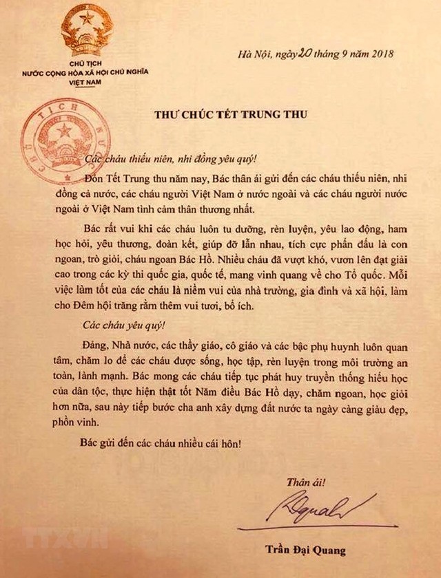 Ngày 20/9, Chủ tịch nước Trần Đại Quang có thư gửi chúc Tết Trung thu tới các cháu thiếu niên, nhi đồng cả nước. (Ảnh: TTXVN)