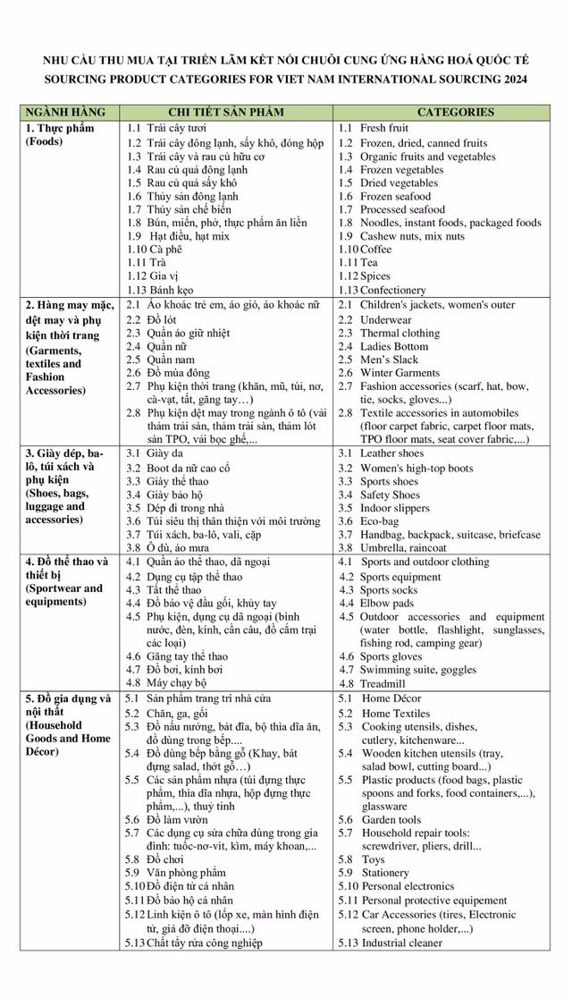 Theo thông tin từ Ban tổ chức Chuỗi sự kiện “Kết nối chuỗi cung ứng hàng hóa quốc tế” (Viet Nam International Sourcing 2024), bên cạnh nhóm hàng “ăn khách” là thực phẩm, năm nay các nhà mua hàng đặc biệt quan tâm đến nhóm hàng dệt may và phụ kiện thời trang; giày dép, ba lô, túi xách và phụ kiện; đồ thể thao và thiết bị; đồ gia dụng và nội thất.