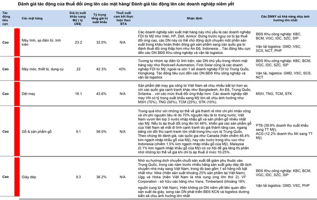 Đối với tác động của việc tăng thuế đối với từng nhóm hàng xuất khẩu, thời điểm hiện tại, mức thuế suất đối với từng mặt hàng vẫn chưa được công bố, nhưng chuyên gia của MBS cho rằng, tác động đến các ngành nghề sản xuất sẽ khác nhau phụ thuộc vào tỷ trọng xuất khẩu sang Mỹ trong tổng giá trị xuất khẩu, cũng như các đối thủ cạnh tranh của Việt Nam trong cùng phân khúc. Bên cạnh đó, một số mặt hàng còn có hiệu lực về mức thuế cam kết được áp dụng theo Hiệp định Thương mại Việt Nam - Hoa Kỳ có hiệu lực tháng 12/2001.