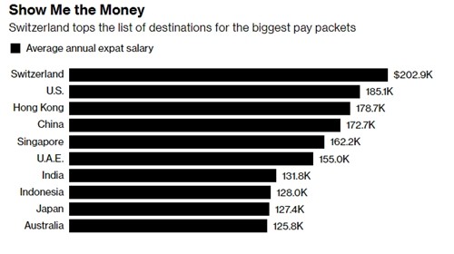 HSBC vừa công bố báo cáo thường niên về lao động làm việc tại nước ngoài - Expat Explorer. Trong 163 quốc gia và vùng lãnh thổ, lao động nước ngoài được trả lương cao nhất tại Thụy Sĩ (hơn 202.000 USD), Mỹ (hơn 185.000 USD) và Hong Kong (Trung Quốc) với hơn 178.000 USD. Mức lương tại Thụy Sĩ cao gấp đôi trung bình toàn cầu.