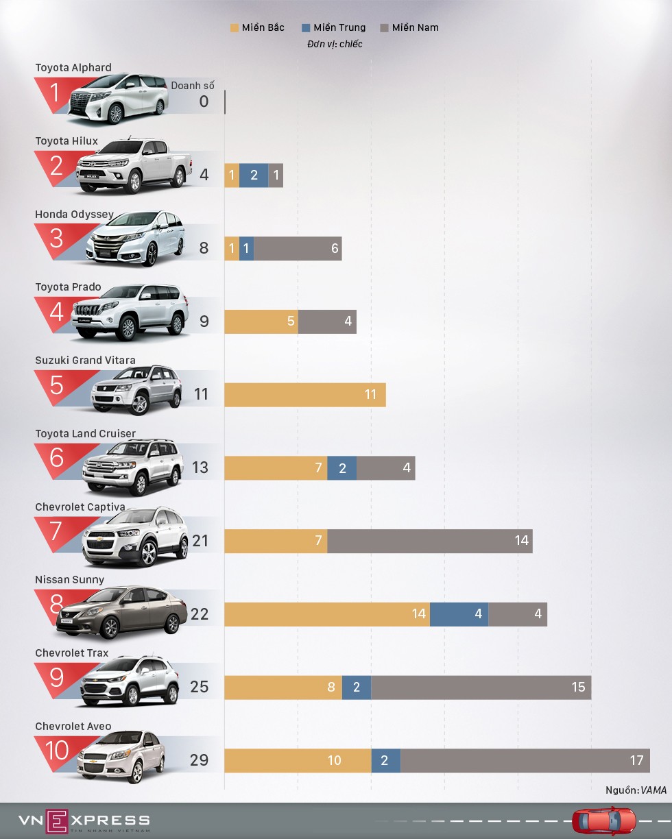 Toyota Alphard không tìm được khách trong tháng 10. Chevrolet Trax, Nissan Sunny hay Honda Odyssey cũng bán khá ít.