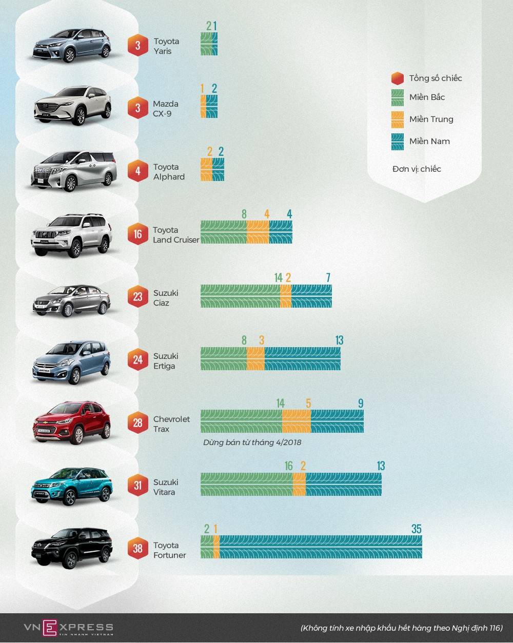 Hầu hết các mẫu xe bán chậm đều là xe nhập khẩu, trong đó Fortuner, Yaris từng bán tốt đều khan hàng.