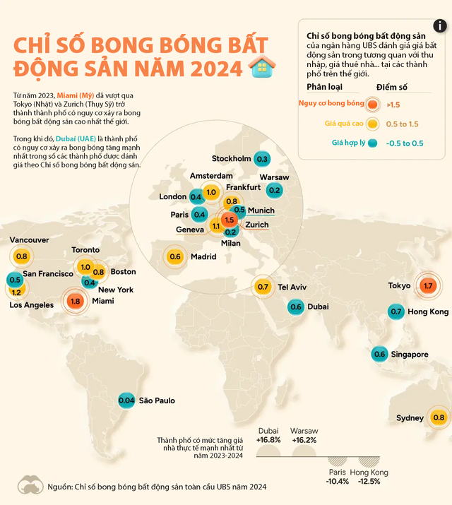 UBS xem xét 25 yếu tố tại 25 thành phố lớn trên thế giới, bao gồm tỷ lệ giá nhà trên thu nhập, tỷ lệ giá nhà trên giá thuê nhà, thay đổi về tỷ lệ vay thế chấp mua nhà trên GDP…để phân tích rủi ro bong bóng bất động sản. Theo UBS, nguy cơ bong bóng là khả năng xảy ra sự điều chỉnh lớn về giá do những biến động lớn của thị trường.