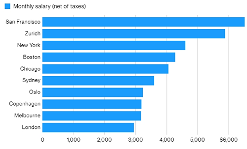 Deutsche Bank vừa công bố báo cáo Mapping the World’s Prices 2019, đánh giá chi phí sinh hoạt và chất lượng sống của cư dân tại 56 thành phố trên thế giới có liên quan đến thị trường tài chính toàn cầu. Theo đó, San Francisco (Mỹ) đã vượt Zurich (Thụy Sĩ) để giữ vị trí thành phố có mức lương cao nhất, với trung bình sau thuế hơn 6.500 USD một tháng. Xếp sau là Zurich (Thụy Sĩ), New York, Boston và Chicago (Mỹ).