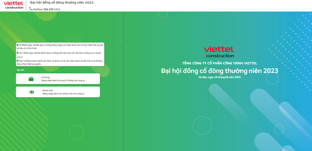 Lịch tổ chức buổi lễ ĐHĐCĐ năm 2023 của Viettel Construction sẽ được tổ chức vào 13h30’ Thứ Ba, ngày 18/4/2023. Cổ đông sẽ có thể tham gia dưới hình thức: trực tiếp hoặc trực tuyến. Tại hình thức trực tuyến cổ đông có thể lựa chọn hình thức ngôn ngữ tiếng Việt hoặc tiếng Anh.