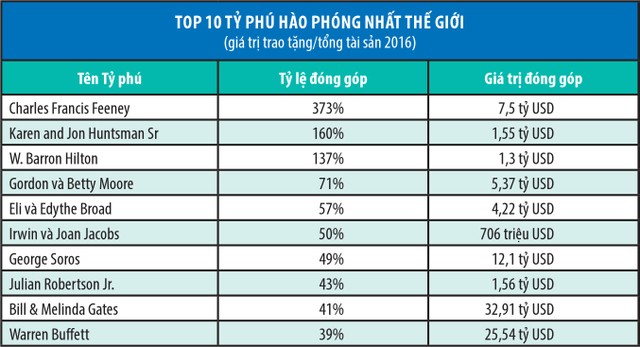 Nhắc tới giá trị tuyệt đối của các khoản từ thiện, thế giới thường ngợi ca những cái tên như tỷ phú đầu tư Warren Buffett, Bill và Melinda Gates, Michael Bloomberg hay George Soros. Tuy nhiên, thực tế, để so sánh mức độ hào phóng của những người giàu nhất hành tinh trong hoạt động từ thiện, điều cần làm là sử dụng chỉ số so sánh hào phóng (tổng mức quyên góp/tổng tài sản).