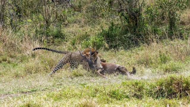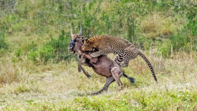 James, người hướng dẫn viên nói rằng, có lẽ con báo hoa mai đang đợi một con linh dương đầu bò non rồi sau đó mới tấn công. Quả thật, những gì sau đó xảy ra quá nhanh khiến Glaser không thể tin nổi. Chưa đến 1 giây, Shujaa đã tìm thấy một con linh dương non, nhảy lên lưng rồi hạ gục nó.