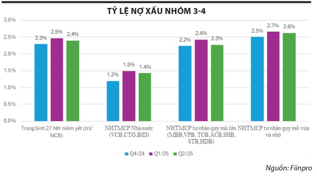 Tại khối ngân hàng tư nhân, báo cáo của Công ty Chứng khoán Vietcombank (VCBS) ước tính, tỷ lệ nợ xấu của MSB giảm mạnh về mức 2% vào cuối năm, so với mức 2,7% tính đến cuối tháng 6/2025 nhờ tín dụng tăng trưởng mạnh mẽ và tăng thu hồi nợ đã xóa. TPBank được kỳ vọng giảm nợ xấu xuống mức 1,9% vào cuối quý IV/2025 từ mức 2,05% trong quý II/2025.