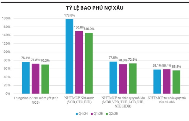 Những con số ước tính trên cho thấy, bức tranh nợ xấu ngành ngân hàng có lẽ phần nào được cải thiện tích cực hơn so với thời điểm cuối quý II/2025, khi 27 ngân hàng niêm yết trên sàn chứng khoán công bố báo cáo tài chính cho thấy, tỷ lệ nợ xấu (nợ nhóm 3-5) trung bình ở mức 2,4% - tăng nhẹ so với mức 2,3% của quý IV/2024. Trong khi đó, tỷ lệ bao phủ nợ xấu có xu hướng giảm dần trong những quý gần đây, từ mức 76,4% vào cuối năm 2024 xuống còn 70,2% trong quý II/2025, cho thấy các ngân hàng đang trích lập dự phòng ít hơn trong 6 tháng đầu năm 2025. Bộ đệm dự phòng cho các khoản nợ xấu đang thu hẹp đáng kể.