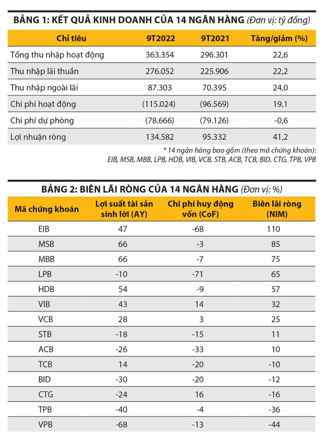 Thống kê của chúng tôi đối với 14 ngân hàng (xem bảng 1) cho thấy, trong 9 tháng đầu năm 2022, đà tăng trưởng lợi nhuận phần lớn là nhờ chi phí dự phòng giảm và mức tăng của chi phí hoạt động thấp hơn mức tăng của các khoản thu nhập.