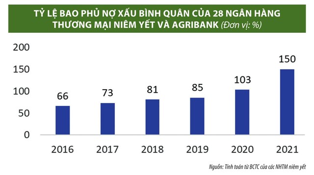 Điểm sáng từ hệ thống tổ chức tín dụng là tỷ lệ bao phủ nợ xấu toàn ngành đã tăng mạnh trong vòng 6 năm qua, từ mức 66% cuối năm 2016 lên 150% nhờ động thái chủ động trích lập dự phòng rủi ro của các ngân hàng thương mại niêm yết. Có những ngân hàng đã tích cực, chủ động trích lập dự phòng rủi ro cho toàn bộ các khoản nợ cơ cấu theo Thông tư 14 trước thời hạn như Vietcombank, BIDV... Tỷ lệ bao phủ nợ xấu hợp nhất còn đạt mức cao kỷ lục từ trước tới nay tại một số ngân hàng như Vietcombank đạt 424%, BIDV đạt 219%, ACB đạt 210%..., qua đó tăng sức đề kháng cho toàn hệ thống trước những diễn biến khó lường của đại dịch.
