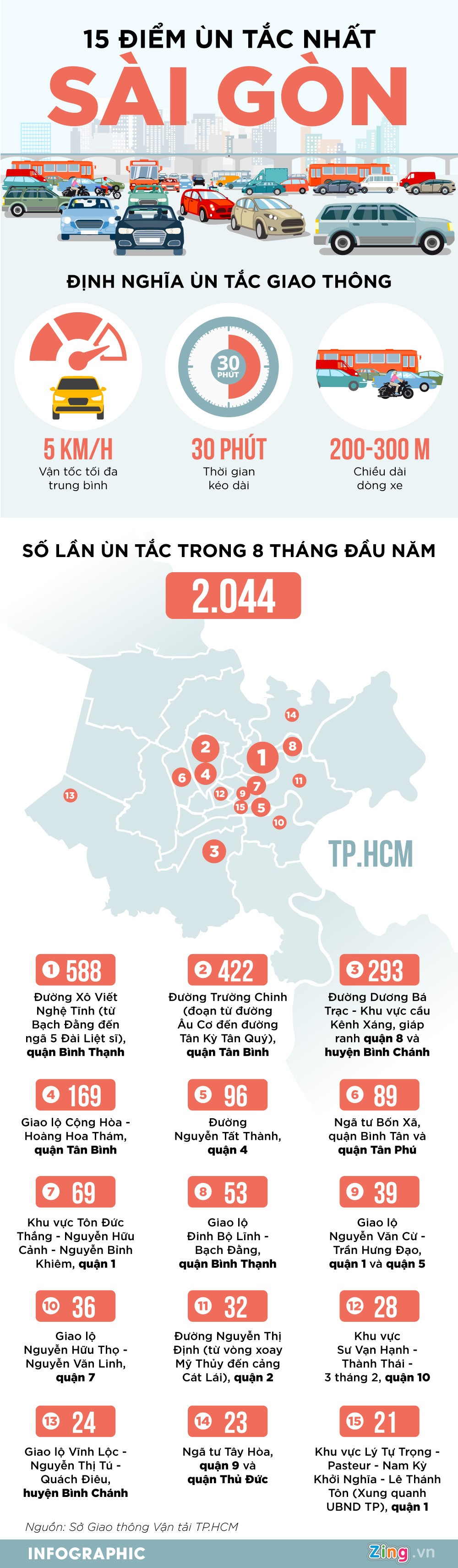 Hai điểm đen ở đường Xô Viết Nghệ Tĩnh và Trường Chinh chiếm quá nửa tổng số lần ùn tắc giao thông trên toàn TP.HCM. Trung bình mỗi ngày, các vị trí này tắc đường 2-3 lần.