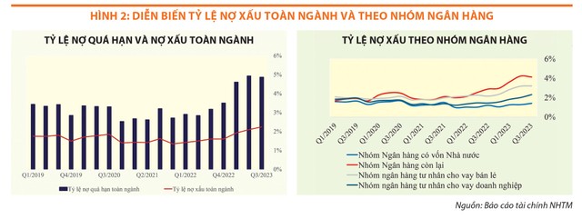 Trong khi nợ xấu ở nhóm các ngân hàng thương mại có vốn nhà nước và các ngân hàng thương mại chuyên cho vay bán lẻ bắt đầu duy trì ổn định, thì nợ xấu tại các ngân hàng thương mại tư nhân cho vay doanh nghiệp tăng mạnh. Nếu như giai đoạn cuối năm 2021, tỷ lệ nợ xấu của các ngân hàng tư nhân chuyên cho vay doanh nghiệp chỉ xấp xỉ các ngân hàng có vốn nhà nước (khoảng 1,4%), thì đến cuối quý III/2023, mức chênh lệch của hai nhóm lớn hơn nhiều (2,3% so với 1,4%).