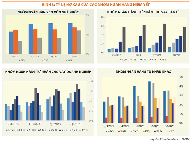 Đối với nhóm ngân hàng thương mại tư nhân chuyên cho vay bán lẻ, sau khi nợ xấu tăng nhanh trong 2 quý đầu năm 2023 thì đã bắt đầu được kiểm soát trong quý III. Một điểm cần lưu ý là nhóm các ngân hàng tư nhân chuyên cho vay doanh nghiệp cũng là những ngân hàng có mức tăng trưởng tín dụng cao kể từ đầu năm đến nay và một tỷ trọng lớn dư nợ được đổ vào các doanh nghiệp lĩnh vực kinh doanh bất động sản.