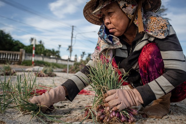 "Mỗi thúng hành (nặng 15 kg), chúng tôi được trả 10.000 đồng. Một ngày, tôi cắt được hơn chục thúng, nên thu nhập cũng đủ ăn", bà Hồng, người cắt hành thuê ở xã An Vĩnh, cho biết.