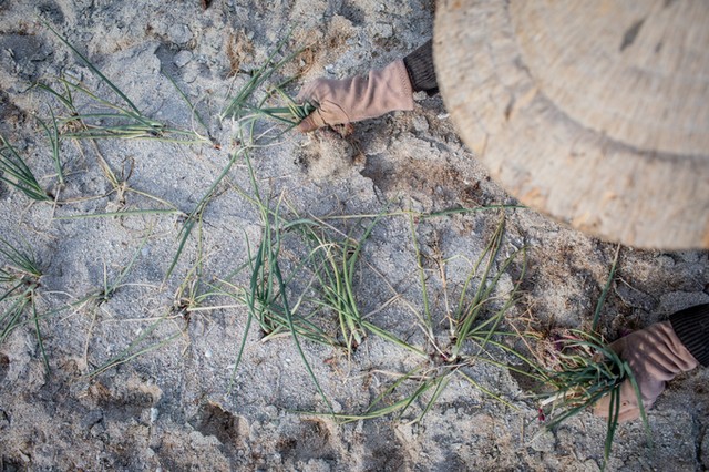 Thoăn thoắt hai bàn tay nhổ hành, bà Bùi Thị Phước (63 tuổi, ở xã An Hải) cho biết, mùa trồng hành trên đảo bắt đầu từ tháng 2 tới tháng 8 âm lịch, rồi tới mùa tỏi. "Mỗi vụ hành kéo dài 50 ngày. Một năm, chúng tôi trồng 4 vụ. Trồng hành cực hơn lúa vì công chăm nhiều nhưng bù lại có ăn".