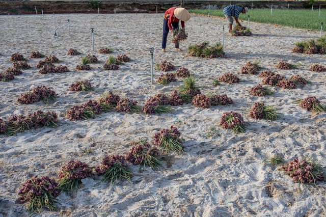 Những củ hành tím được nông dân giũ sạch đất cát và buộc lại thành từng bó, phơi khô trước khi vận chuyển về nhà.