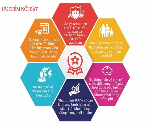 - Quyền lợi Tuổi vàng được hoàn lại 100% chi phí bảo hiểm rủi ro vào năm Người được bảo hiểm chính 75 tuổi.