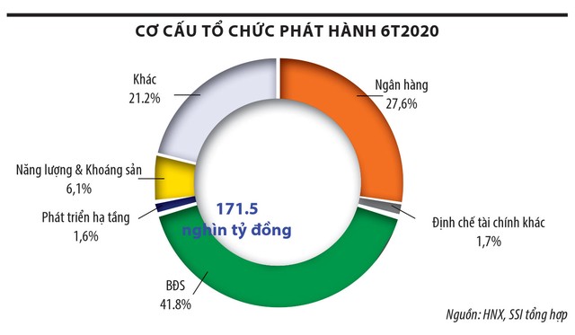 Thống kê của Công ty chứng khoán SSI cho thấy, trong 6 tháng đầu năm, tổng giá trị trái phiếu doanh nghiệp phát hành đạt mức 171.500 tỷ đồng với riêng giá trị trái phiếu phát hành riêng lẻ đạt 161.550 tỷ đồng (chiếm 94,2%). Trong đó, 70% chủ thể phát hành là các ngân hàng và công ty bất động sản và bất động sản trở thành nhóm phát hành trái phiếu lớn nhất thị trường với lượng phát hành lên tới 71.600 tỷ đồng, tăng 57,5% so với cùng kỳ và chiếm xấp xỉ 42% tổng giá trị phát hành.