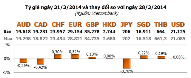 Với các ngoại tệ khác, JPY giảm mạnh nhất với -0,7%; tiếp đến là CAD với -0,42%; AUD với -0,29%. Ở chiều tăng, EUR dẫn đầu với 0,32%; tiếp đến là CHF với 0,30%; SGD với 0,22%...