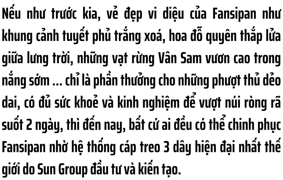 Trên cáp treo lên, xuống đỉnh Fansipan hùng vĩ, du khách sẽ dễ dàng bắt gặp những tấm lưng lom khom ướt đẫm mồ hôi cần mẫn gieo hạt, trồng hoa, chăm sóc cây cối… để tiếp tục thắp sáng đỉnh Fansipan, gọi Sa Pa bốn mùa xuân về ngập tràn hương sắc. Những công trình đồ sộ, kỳ vĩ hơn đang và sẽ được xây dựng, những sản phẩm du lịch đẳng cấp quốc tế sẽ tiếp tục được đầu tư cho người Việt. Và cứ thế, Sun Group kiên định theo đuổi đến cùng khát vọng biến Việt Nam trở thành một cường quốc du lịch, nơi tinh hoa năm châu thu gọn lại trong dải đất hình chữ S thân thương.