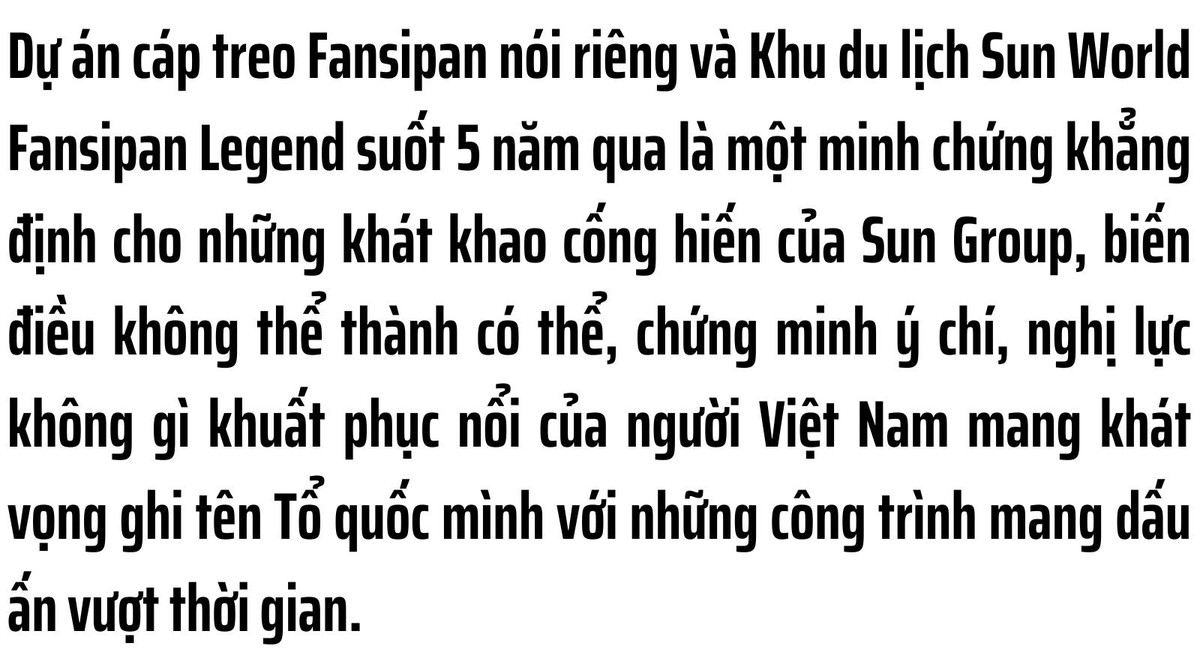Có thể nói, cáp treo Fansipan và quần thể văn hóa tâm linh trên “Nóc nhà Đông Dương” là một minh chứng khẳng định cho những khát khao cống hiến của Sun Group, biến điều không thể thành có thể, chứng minh ý chí, nghị lực không gì khuất phục nổi của người Việt nam mang khát vọng ghi tên Tổ quốc mình với những công trình mang dấu ấn vượt thời gian.