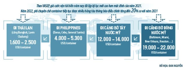 Cụ thể, theo Vasep, giá cước vận chuyển hàng ở hầu hết các chặng tăng 10 - 20% so với trước. Để xuất được một container (cont) 40 feet qua bờ Đông Hoa kỳ (Florida) thì giá cước khoảng 16.400 USD (tương đương 380 triệu đồng).