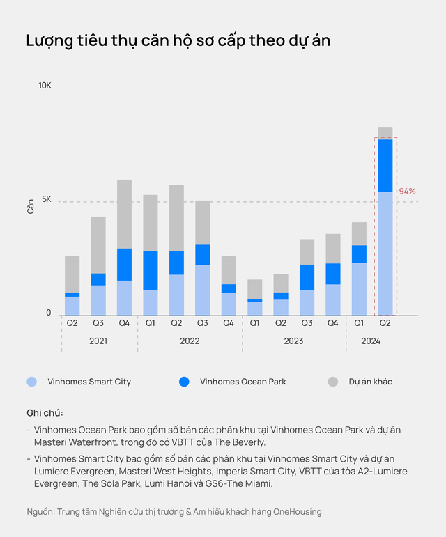 Trong đó, hai đại đô thị Vinhomes Ocean Park và Vinhomes Smart City chiếm hơn 90% thị phần toàn thị trường Hà Nội. Vinhomes Smart City ghi nhận dự án mới cao cấp và hạng sang đồng loạt mở bán. Số lượng bán của Vinhomes Ocean Park cũng tăng 194% so với quý trước và tăng 674% so với cùng kỳ 2023, chủ yếu từ các dự án cao cấp (Masteri Waterfront, Zurich, Beverly...).