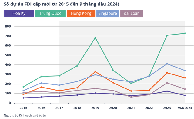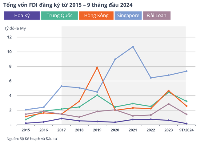 Giai đoạn 2017– tháng 9/2024, tổng vốn FDI đăng ký và thực hiện vào Việt Nam tăng trung bình hàng năm lần lượt là 3,3% và 1,9%. Cùng kỳ, vốn FDI đăng ký từ Trung Quốc, Hồng Kông, Singapore và Đài Loan vào Việt Nam cũng theo xu hướng tăng.