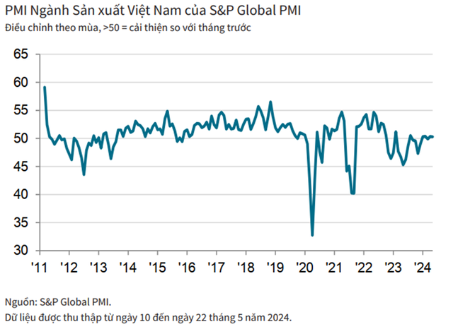 Bên cạnh đó, tại ngành sản xuất, lĩnh vực có ảnh hưởng gián tiếp đến bán lẻ, theo Báo cáo Chỉ số Nhà Quản trị Mua hàng - Purchasing Managers' Index (PMI) mới nhất của S&P Global, trong tháng 5 vừa qua, ngành sản xuất của Việt Nam không thay đổi khi đạt 50,3 điểm. Số lượng đơn đặt hàng mới tiếp tục tăng mạnh giúp sản lượng của các doanh nghiệp tăng nhanh hơn, và hoạt động mua hàng của các doanh nghiệp cũng tăng. "Kết quả này cho thấy các điều kiện kinh doanh của ngành đã cải thiện nhẹ tháng thứ hai liên tiếp. Sức khỏe của ngành sản xuất chỉ thay đổi nhẹ trong 5 tháng đầu năm 2024", báo cáo nhận xét.