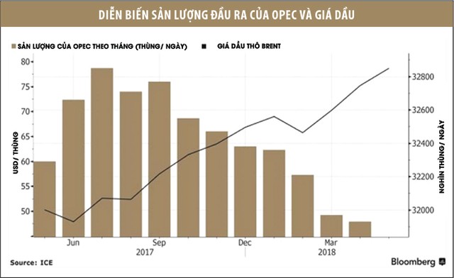 Từ đầu năm 2018 tới nay, OPEC cùng các đồng minh, đứng đầu là Nga đã đồng ý kiềm chế sản lượng đầu ra ở mức 1,8 triệu thùng/ngày nhằm giảm lượng dầu tồn kho trên toàn cầu. Thậm chí, trong tháng 4, các thành viên tham gia thỏa thuận này đã giảm nhiều hơn 52% so với yêu cầu, chủ yếu bởi gián đoạn nguồn cung từ Venezuela.
