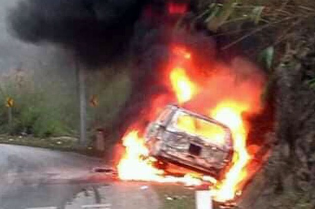 Cú đâm mạnh, khiến chiếc Ford bị ép tụt xuống rãnh nước cạnh chân núi và bốc cháy. Khoảng 30 phút sau, xe chỉ còn trơ khung sắt. Xe bán tải nằm giữa đường và hư hỏng nặng phần đầu.