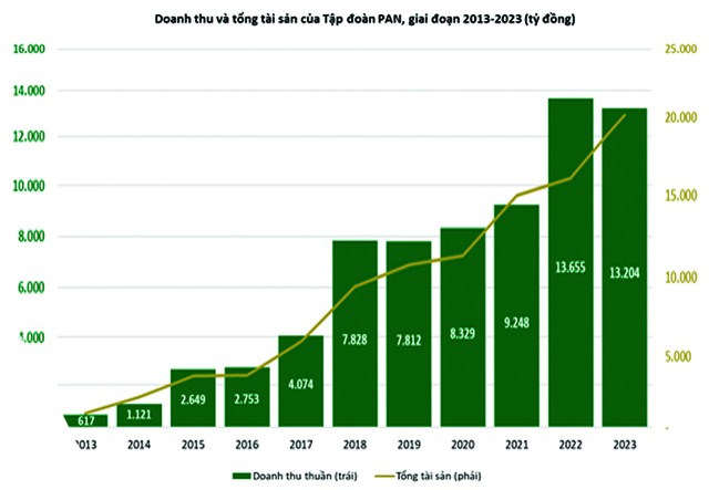 Báo cáo tài chính hợp nhất quý III/2024 của Tập đoàn PAN cho thấy, trong 9 tháng đầu năm 2024, doanh thu và lợi nhuận sau thuế của cổ đông công ty mẹ PAN lần lượt đạt 11.917 tỷ đồng và 363 tỷ đồng, tương đương với mức tăng trưởng 32% về doanh số và 80,6% về lợi nhuận so với cùng kỳ năm ngoái.