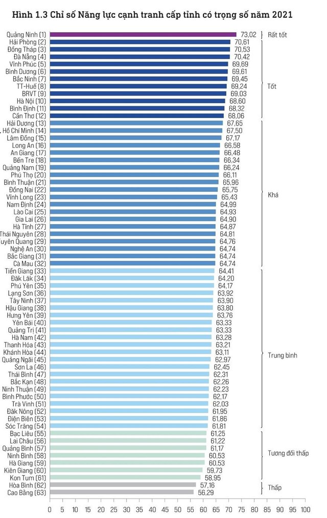 Các địa phương phía cuối bảng xếp hạng PCI năm nay là Cao Bằng (63), Hòa Binh (62), Kon Tum (61), Kiên Giang (60), Hà Giang (59), Ninh Bình (58), Quảng Bình (57), Lai Châu (56), Bạc Liêu (55), Sóc Trăng (54).