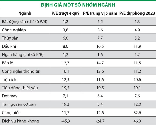 Một số nhóm ngành có định giá cao hơn quá khứ chủ yếu là nhóm cổ phiếu bị ảnh hưởng mạnh về triển vọng lợi nhuận năm 2023 như dệt may, tài nguyên cơ bản, cảng biển, dịch vụ hàng không. Triển vọng của các nhóm trên có được cải thiện hay không sẽ phụ thuộc nhiều vào tốc độ phục hồi kinh tế.
