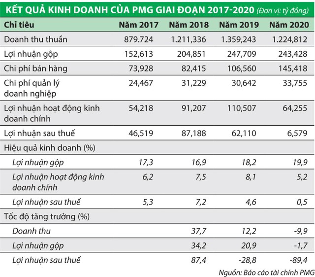 Mặc dù có tiềm năng phát triển, nhưng hiệu quả kinh doanh 2 năm qua của PMG suy giảm. Cụ thể, biên lợi nhuận ròng giảm từ 7,2% năm 2018 xuống 0,5% năm 2020, chủ yếu do chi phí tài chính và chi phí bán hàng gia tăng.
