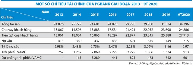 Tại thời điểm 30/9/2020, tổng tài sản của PGBank tăng 9% so với đầu năm, lên mức hơn 34.396 tỷ đồng. Tiền gửi của khách hàng tăng 10% so với đầu năm, đạt hơn 27.913 tỷ đồng, chủ yếu là tiền gửi của cá nhân, chiếm 67%, còn lại là tiền gửi của tổ chức kinh tế. Cho vay khách hàng tăng nhẹ 5% so với đầu năm, ghi nhận gần 24.886 tỷ đồng.