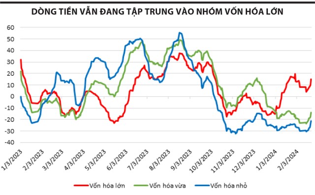 Dòng tiền tiếp tục dồn sức vào nhóm vốn hóa lớn (VN30), trong khi nhóm vốn hóa vừa và nhỏ gần như bị bỏ rơi kể từ đầu năm 2024 tới nay. Khả năng trong thời gian tới, dòng tiền sẽ tiếp tục chảy vào nhóm vốn hóa lớn, bởi nhóm này chưa đạt ngưỡng giới hạn, ít nhất là so với năm 2023, trong khi dòng tiền vào nhóm vốn hóa lớn chưa quá nóng để dịch chuyển sang các nhóm khác.