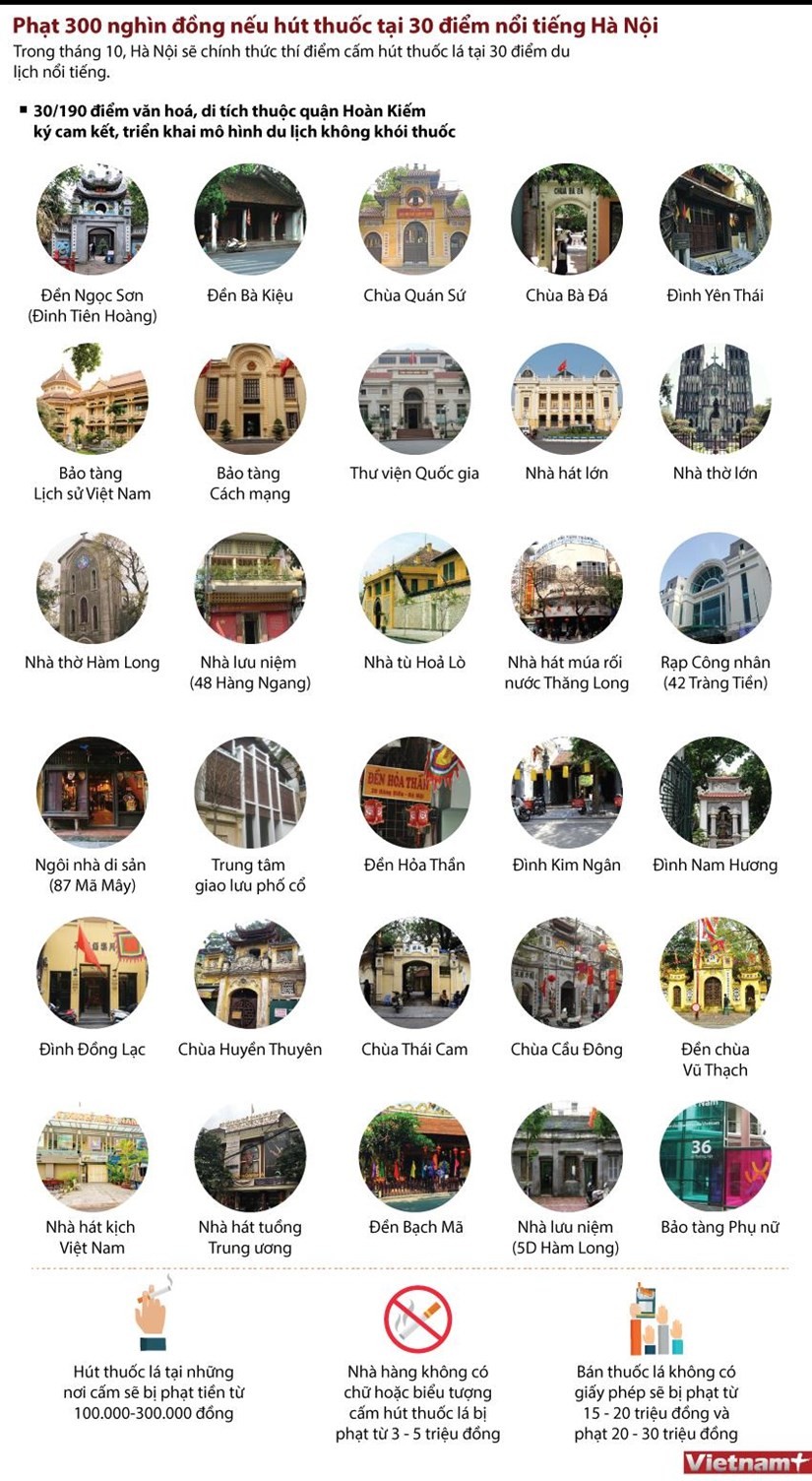 Đây là 30 trong tổng số 190 điểm văn hoá, di tích thuộc quận Hoàn Kiếm, Hà Nội sẽ thí điểm thực hiện mô hình du lịch không khói thuốc.