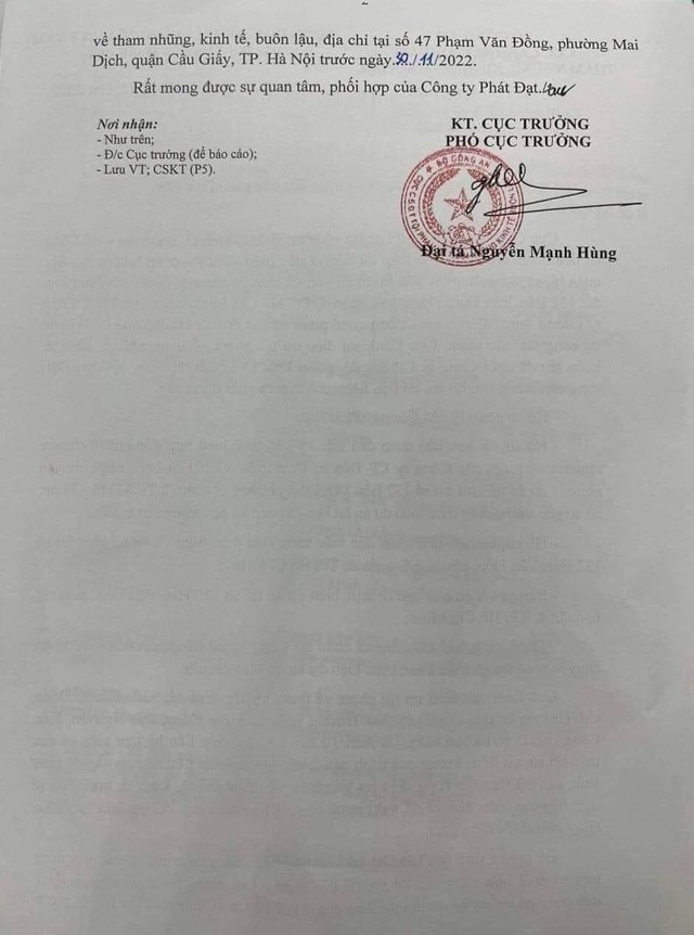 Thứ nhất, công văn số 3815/CSKT-P5 ngày 16/11/2002 chỉ đề nghị Công ty Phát Đạt cung cấp hồ sơ tài liệu phục vụ công tác xác minh để Bộ Công An đang điều tra một vụ án khác, không liên quan đến Công ty Phát Đạt.