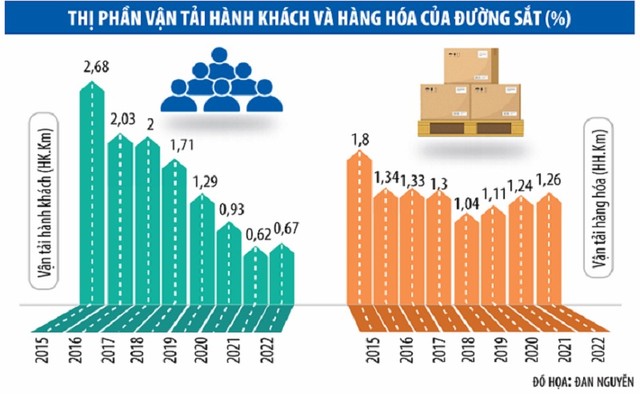 Tính đến cuối năm 2022, thị phần vận tải hành khách bằng đường sắt chỉ đạt 0,12%; thị phần vận tải hàng hóa đạt khoảng 0,4% toàn ngành vận tải. Doanh thu của VNR chỉ đạt khoảng 3.600 tỷ đồng, bằng đúng chi phí bảo trì hệ thống đường sắt quốc gia mà Nhà nước cấp và bằng 1/10 so với Vietjet Air.