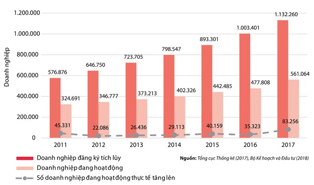 số lũy kế về doanh nghiệp được đăng ký, doanh nghiệp đang hoạt động và mức tăng số lượng doanh nghiệp đang hoạt động mỗi năm.