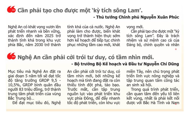 “Đã hơn nửa thế kỷ từ khi Bác đi xa, Nghệ An vẫn chưa trở thành một trong những tỉnh khá nhất miền Bắc, vì vậy, tôi đề nghị Đảng bộ tỉnh Nghệ An phải đặt tinh thần quyết tâm cao nhất, thực hiện cho được điều mong mỏi thiết tha của Bác Hồ trong thời gian ngắn nhất. Nghệ An cần tạo cho được một kỳ tích sông Lam mà cả nước đang mong đợi”, Thủ tướng Nguyễn Xuân Phúc nhấn mạnh điều này trong phát biểu chỉ đạo tại Đại hội Đại biểu Đảng bộ tỉnh Nghệ An lần thứ XIX, nhiệm kỳ 2020 - 2025.