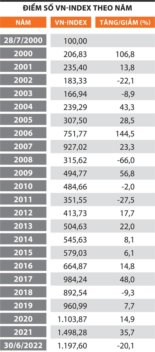 Nhưng như bất kỳ thị trường nào khác, bên cạnh những nốt thăng, chứng khoán Việt Nam cũng chứa đựng nhiều nốt trầm. Tháng 5/2015, VN-Index từ 640 điểm về 512 điểm, giảm 20%; tháng 4/2018, VN - Index từ 1.200 điểm về 883 điểm, giảm 26%; tháng 2/2020, từ 933 điểm về 650 điểm, giảm 30%. Từ tháng 4/2022 đến nay, nhà đầu tư chịu thử thách khi VN-Index giảm 25%, từ 1.534 điểm về 1.150 điểm (tính trong phiên giao dịch).