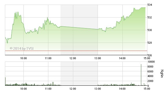 GAS tiếp tục là tâm điểm trong phiên giao dịch chiều. Khối nội và khối ngoại tiếp tục đua mua GAS, giúp giá cổ phiếu GAS tăng gần chạm trần với thanh khoản ở mức cao. Đóng cửa, GAS tăng 4,55%, lên 77.000 đồng/CP và khối lượng khớp lệnh đạt hơn 1,95 triệu cổ phiếu, mức cao nhất kể từ phiên 4/1/2013.