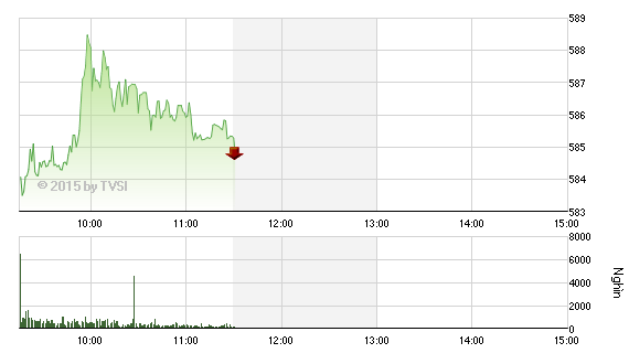 Kết thúc đợt 1, VN-Index tăng 3,73 điểm (+0,64%), lên 584,08 điểm với tổng khối lượng giao dịch đạt 6,43 triệu đơn vị, giá trị 96,15 tỷ đồng.