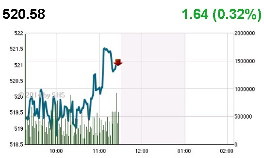 Kết thúc phiên sáng, VN-Index tăng 1,64 điểm (+0,32%) lên 520,58 điểm, tổng khối lượng giao dịch đạt 36,14 điểm, giá trị 587,11 điểm. Trong đó giao dịch thỏa thuận đạt 1 triệu đơn vị, trị giá 19,74 tỷ đồng.