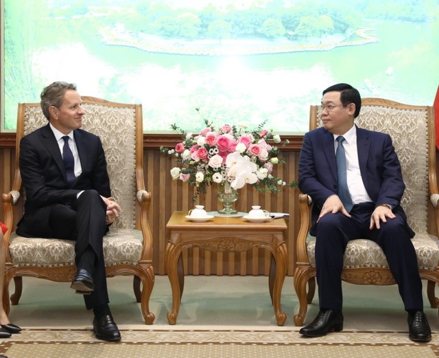 Tiếp Chủ tịch Quỹ đầu tư Warburg Pincus toàn cầu Timothy F. Geithner, từng giữ chức Bộ trưởng Tài chính Hoa Kỳ giai đoạn (2009-2013), Phó Thủ tướng Vương Đình Huệ đánh giá cao những hoạt động hợp tác kinh doanh của Warburg Pincus tại Việt Nam vừa qua.