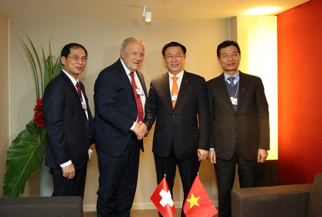 Tại cuộc gặp giữa Phó Thủ tướng Vương Đình Huệ và Ủy viên Hội đồng liên bang Thụy Sĩ Johannin Ammann bên lề Hội nghị WEF Davos, hai bên đánh giá quan hệ Việt Nam-Thụy Sĩ đang phát triển tốt đẹp, hợp tác kinh tế đạt nhiều kết quả tích cực; nhất trí tăng cường phối hợp tại các diễn đàn đa phương, và bày tỏ mong muốn sẽ ký Hiệp định Thương mại tự do giữa Việt Nam với khối EFTA (gồm 4 nước Thụy Sĩ, Liechtenstein, Na Uy và Iceland) trong 6 tháng đầu năm 2018.