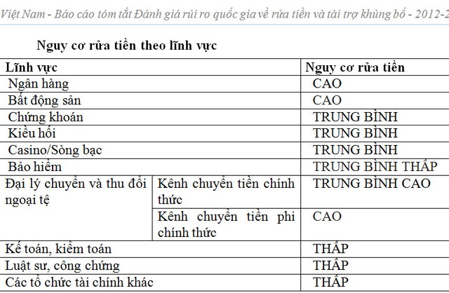 “Trên cơ sở phân tích những nội dung có liên quan, nguy cơ rửa tiền đối với lĩnh vực ngân hàng là cao”, Báo cáo nhấn mạnh.